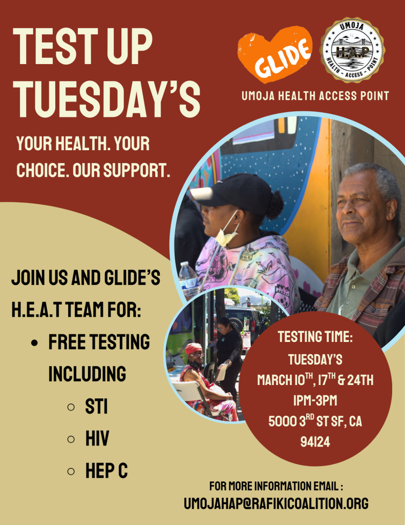 Join us and UCSF: Alliance Health Project for free STI, HIV, and Hep C testing every Friday at Umoja HAP!