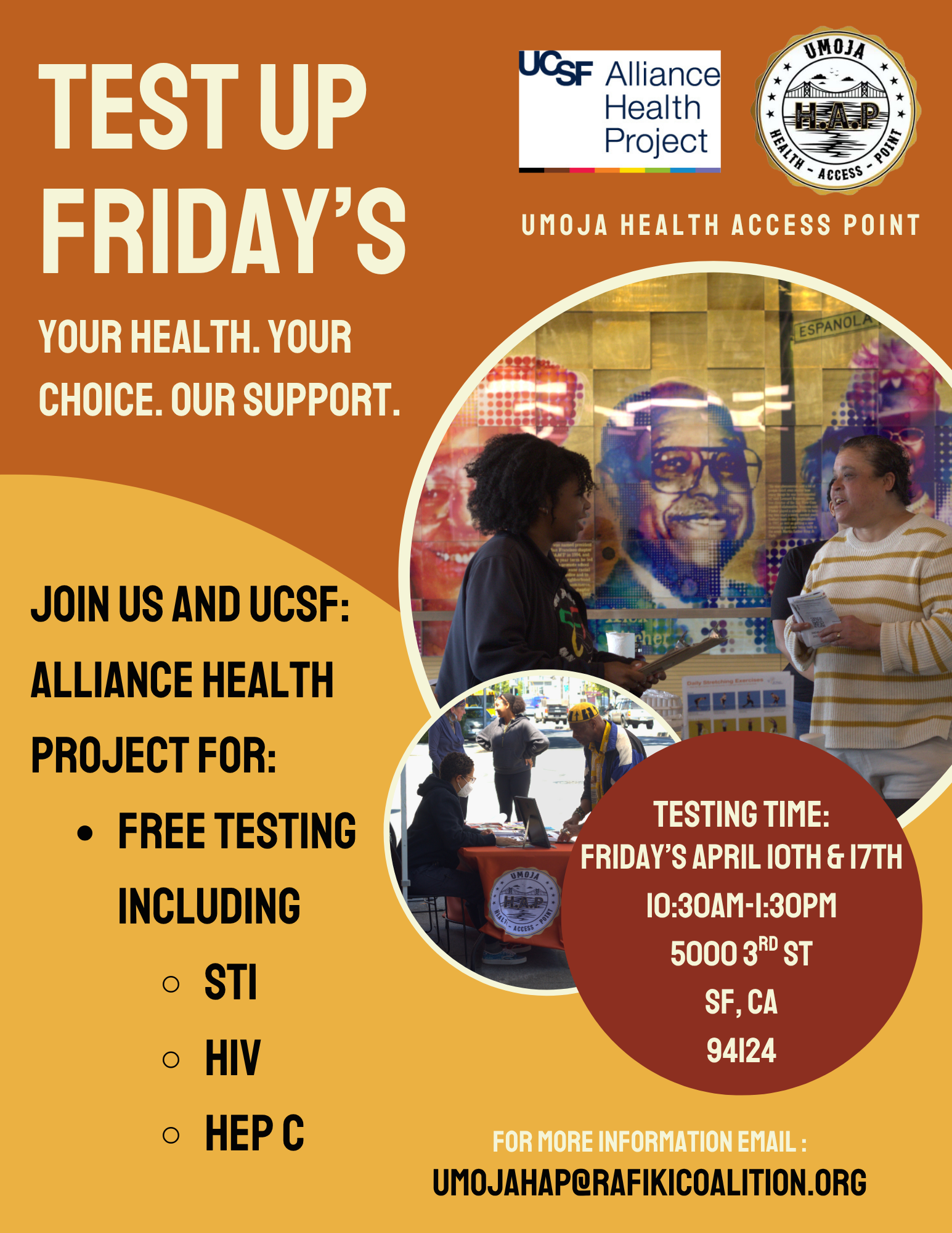 Join us and UCSF: Alliance Health Project for free STI, HIV, and Hep C testing every Friday at Umoja HAP!