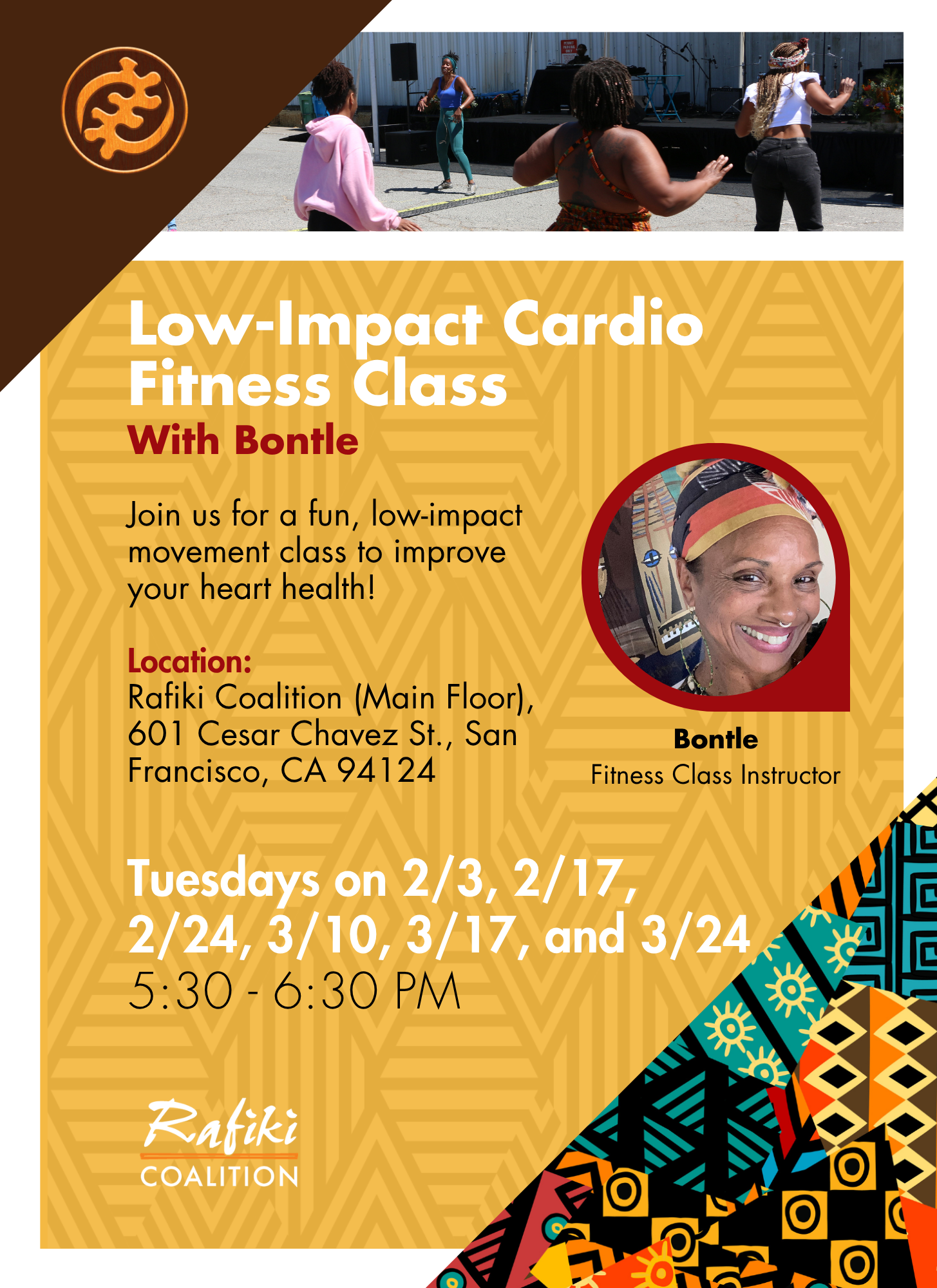 • Low-Impact Cardio Fitness class With Bontle Join us for a fun, low-impact movement class to improve your heart health! This class is led by fitness instructor Bontle. Where: Rafiki Coalition (Main Floor), 601 Cesar Chavez Street, San Francisco, CA 94124 When: Tuesdays on 2/3, 2/17, 2/24, 3/10, 3/17, and 3/24 from 5:30 – 6:30 PM