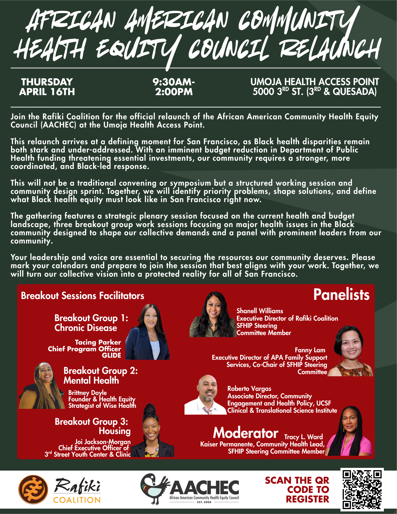 African American Community Health Equity Council (AACHEC) Relaunch When: Thursday, April 16, 2026, from 9:30 AM – 2 PM Where: Umoja HAP – 5000 3rd Street, San Francisco, CA 94124 Join the Rafiki Coalition for the official relaunch of the African American Community Health Equity Council (AACHEC) at the Umoja Health Access Point. This