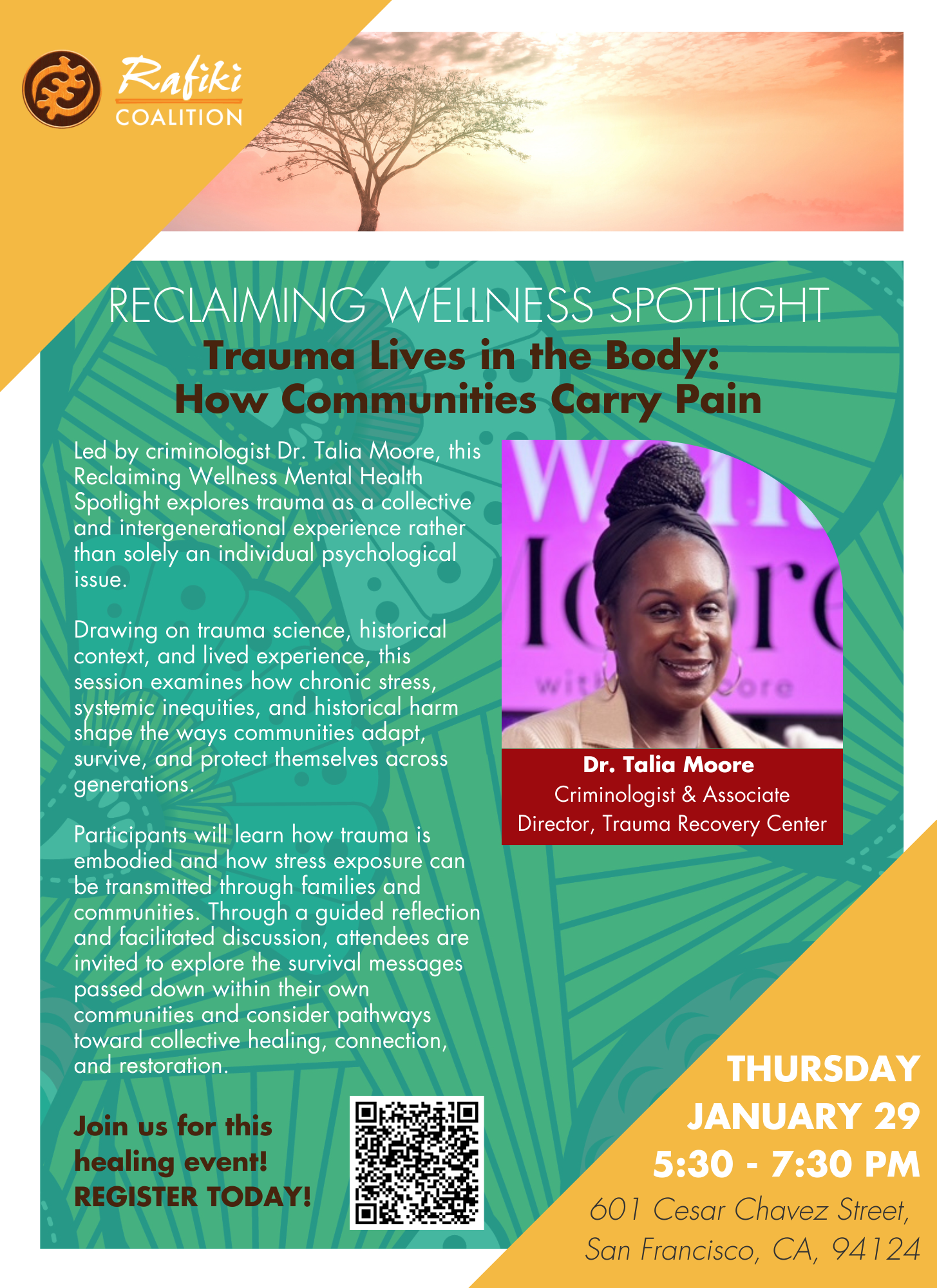 • Reclaiming Wellness: Trauma Lives in the Body: How Communities Carry Pain Thursday, January 29th from 5:30 PM – 7:30 PM (Doors open at 5:15 PM) At Rafiki Coalition, 601 Cesar Chavez, San Francisco, CA, 94124 Led by criminologist Dr. Talia Moore, this Reclaiming Wellness Mental Health Spotlight explores trauma as a collective and intergenerational experience